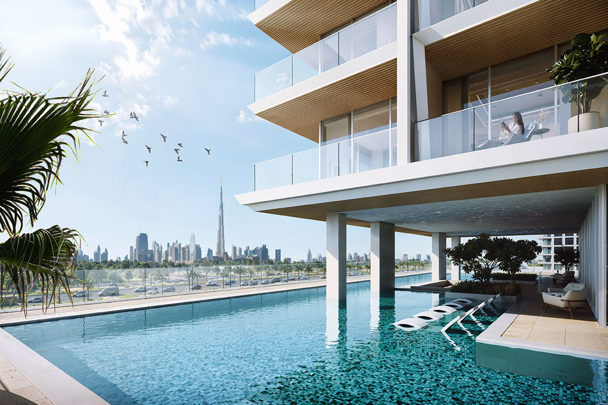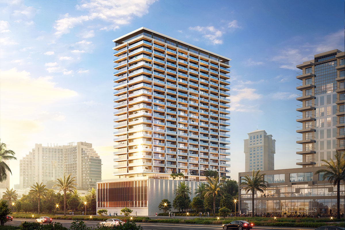 The project features a sleek glass façade, floor-to-ceiling windows, spacious balconies, and stunning views of Burj Khalifa and Dubai Frame.