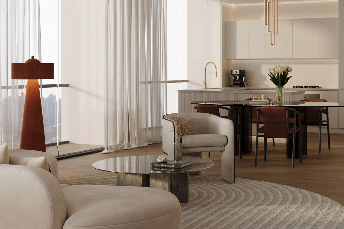 Each 3-bedroom apartment offers a generous open-plan living and dining area, a modern gourmet kitchen, three well-appointed bedrooms, and stylish bathrooms. Floor-to-ceiling windows allow abundant natural light and provide stunning views of the surrounding cityscape. Smart home technology and premium finishes ensure a convenient, luxurious lifestyle.