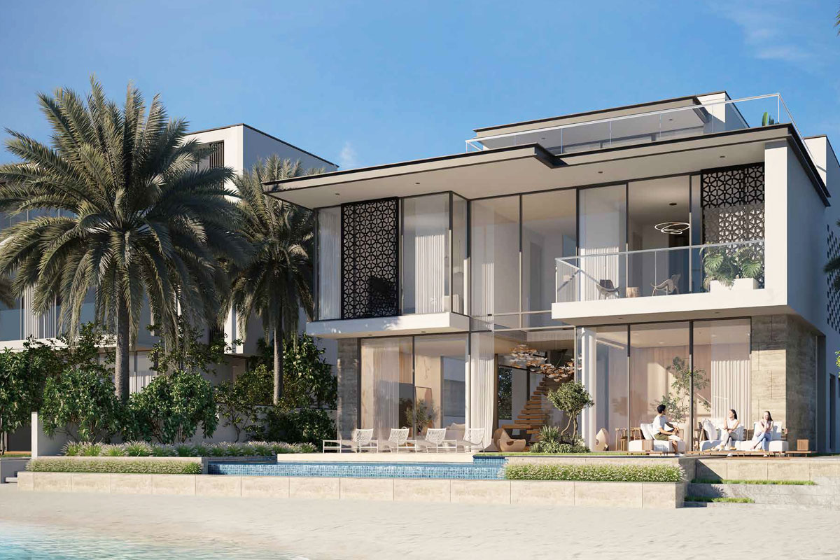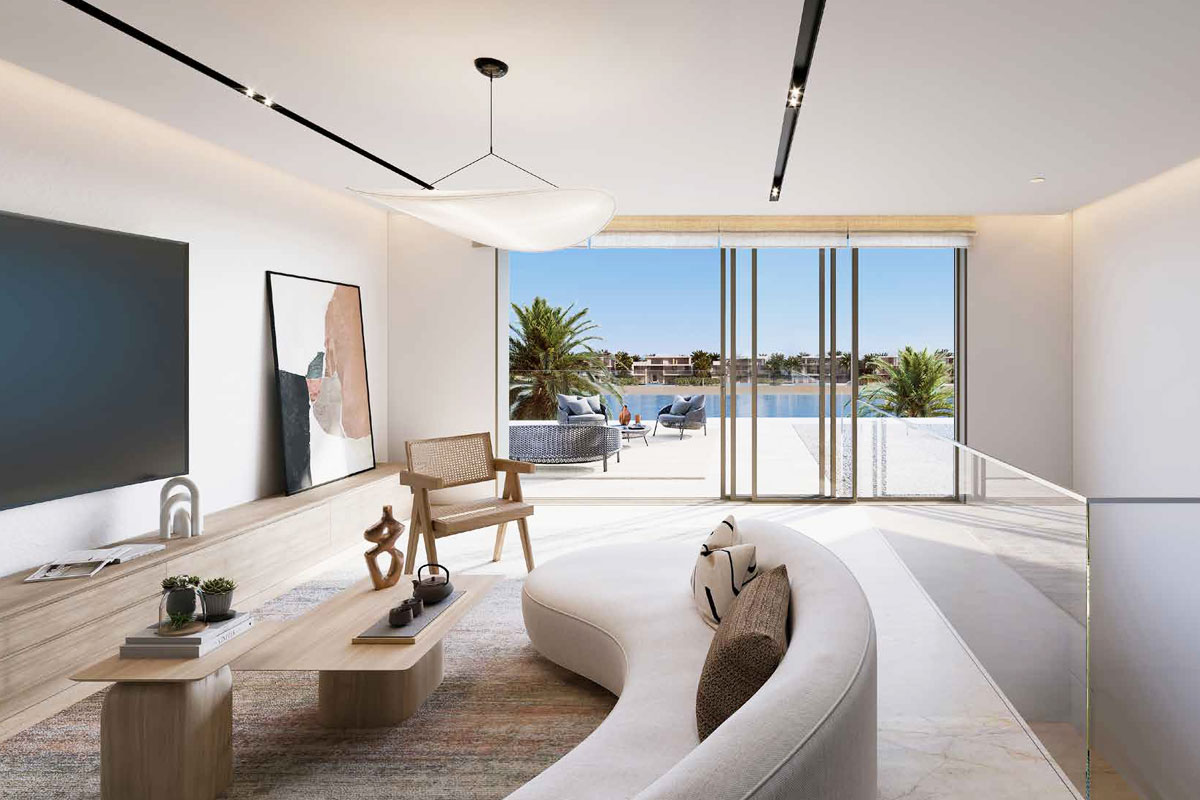 Palm Jebel Ali features luxurious waterfront villas designed with floor-to-ceiling windows, neutral palettes, and high-end finishes, offering a serene and sophisticated living experience.