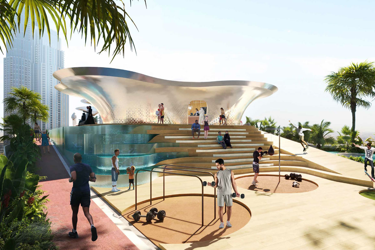 Amenities include a Sky pool, gym with TRX stations, trampoline park, boxing zone, SKY yoga, spa facilities, and wellness-focused community areas.